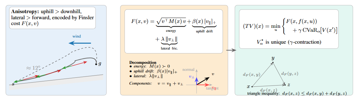 FiRL (Finslerian Reinforcement Learning) is a risk-sensitive RL framework for legged locomotion that embeds direction-dependent energy and failure risk into a Finsler cost F(x, v) and optimizes a CVaR tail-risk objective. We prove that the associated CVaR–Finsler Bellman operator is a γ-contraction whose fixed point induces a quasi-metric over states, and instantiate it in an FiRL-AC actor–critic algorithm. On anisotropic MuJoCo terrains (e.g., 12° slopes and lateral disturbances), FiRL learns safer, more energy-efficient gaits than risk-neutral baselines, reducing worst-case impact forces by over 35% and energy use by about 15% while improving success rates.